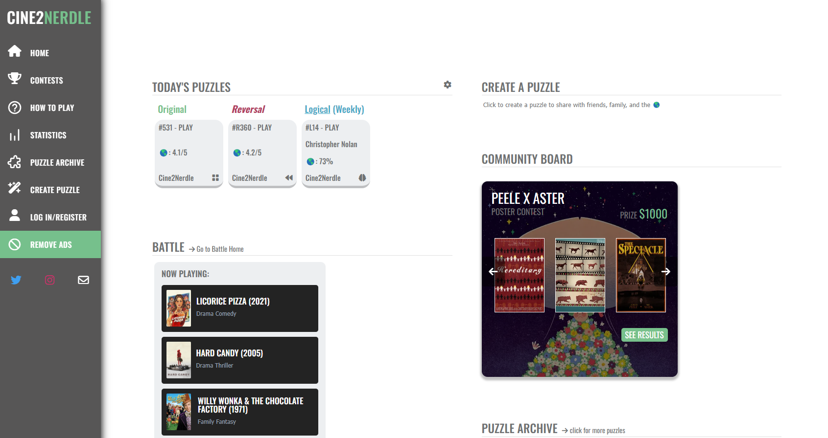 A daily movie puzzle. Can you find the hidden movies? Sequel to CineNerdle!