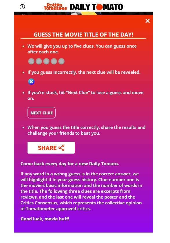 How well do you know movies? Movie Grid is a daily trivia game where you use the clues to pick a movie for each spot on the grid. Come back every day for a new puzzle!
